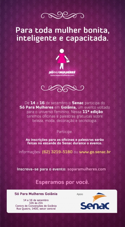 De 14 a 16 de setembro, o Senac participa da 11ª edição da Feira Só Para Mulheres, que será realizada no Centro de Cultura e Convenções de Goiânia. O evento tem como foco O Crescimento Acentuado do Poder Aquisitivo da Mulher e oferece informações atualizadas, bem-estar e entretenimento para o público feminino através dos conceitos: Ser mulher de corpo e alma; ser mulher plugada no mundo; ser mulher que investe no futuro; ser mulher em família.