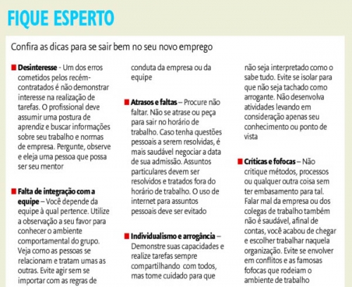 Como ponto de partida, o funcionário deve ficar atento ao cumprimento do horário de expediente, não chegar atrasado com muita frequência, tampouco faltar ao trabalho. Adriana explica que, quando for necessário ultrapassar o horário fixado, o novato deve observar se há mobilização do restante da equipe. “Se todos estiverem comprometidos a ficar um pouco mais tarde é importante que ele participe”, diz. Mas, adverte, estender o horário somente para mostrar interesse não é conveniente. Essa hora-extra precisa ser produtiva.