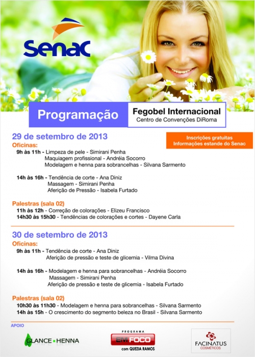 Adrianne VitoreliNos dias 29 e 30 de setembro o Senac participa, em Caldas Novas, da Feira da Beleza Internacional (Fegobel), no Centro de Convenções do Hotel Di Roma. O Senac ministrará oficinas e palestras gratuitas nos segmentos de cabeleireiro, estética e beleza. As inscrições serão feitas no estande, que também vai oferecer aferição de pressão e teste de glicemia. Mais informações: (64) 3453-1241.