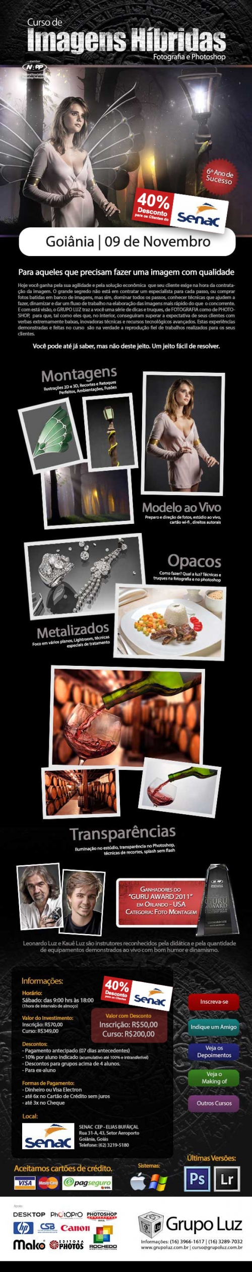 O Senac Elias Bufáiçal, em parceria com o Grupo Luz, realiza no dia 9 de novembro o Curso de Imagens Híbridas: Fotografia e Photoshop, no Espaço Cultural do Senac Goiás. O evento conta com os Fotógrafos Leonardo Luz e Kauê Luz, ganhadores do “Guru Award 2011” em Orlando, que longe das fotos batidas dos bancos de imagens, ensinam o domínio de truques de fotografia e photoshop.
