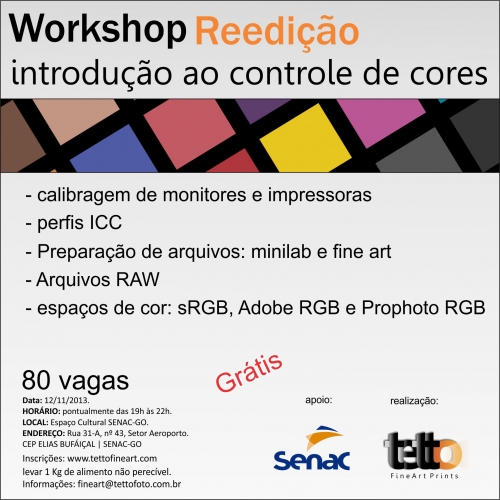 A Tetto Fine Art Prints realiza no dia 12 de novembro, em parceria com o Senac Elias Bufáiçal, o Workshop: introdução ao controle das cores. Direcionado a fotógrafos amadores ou profissionais que tenham conhecimento básico em Lightroom ou Photoshop, o workshop acontece no Espaço Cultural do prédio da Administração Regional do Senac, no Setor Aeroporto, das 19h às 22h.