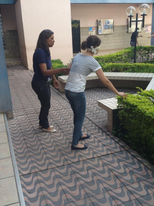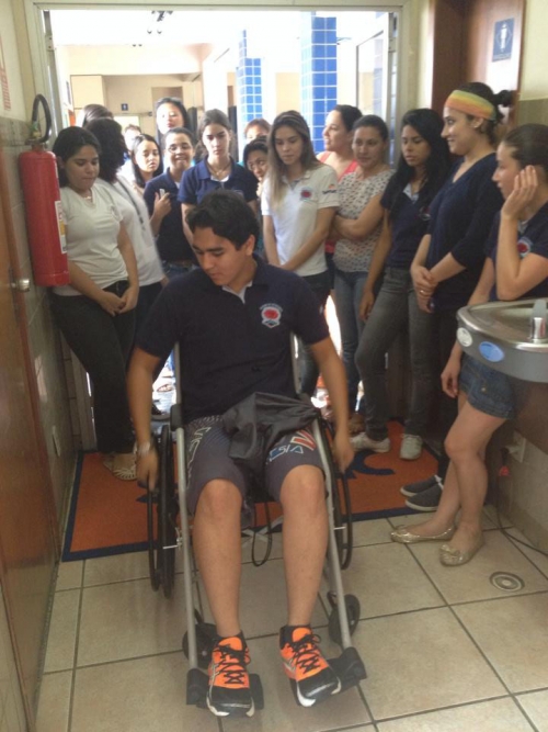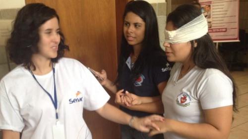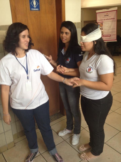 A turma de 20 alunos percorreram o hall, banheiros e instalações do Senac e sentiram a experiência de pessoas que possuem deficiência visual, física ou dos idosos que necessitam do uso de auxílio motor. Com os olhos vendados, muletas, bengalas e cadeira de rodas, os alunos conheceram na prática as necessidades de um ambiente acessível.
