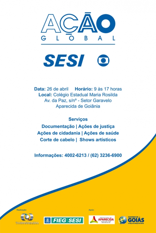 O Senac em Aparecida de Goiânia participa, neste sábado (26/04), da 21ª edição da Ação Global Nacional, que será realizado em Goiás no Colégio Estadual Maria Rosilda – Av. da Paz, Setor Garavelo, das 9h às 17h. Com o tema “Ação Global Mulheres. Qualidade de vida para a família”, esta edição tem a finalidade de atender principalmente o segmento feminino, mas sem se esquecer dos tradicionais serviços para população.