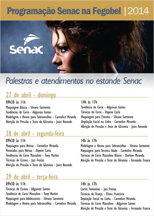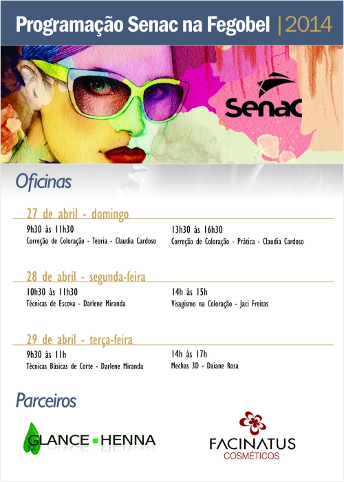 O evento acontece das 9 às 17 horas. As inscrições serão gratuitas e feitas no próprio estande. Facinatus Cosméticos e a Glance Henna são os parceiros do Senac na Fegobel.