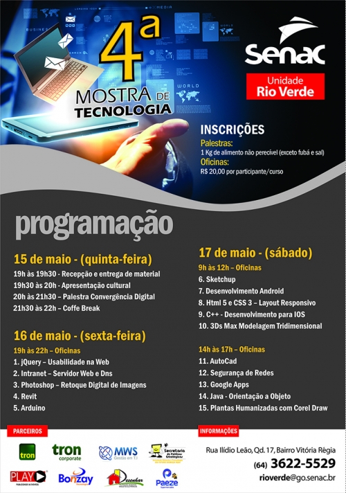 Desenvolvimento Android, Google Apps, Layout Responsivo, Sketchup. Ficou interessado pelos temas? O Senac de Rio Verde realiza, de 15 a 17 de maio, a 4ª Mostra Senac de Tecnologia, na sede da unidade. O evento contará com uma palestra com tema Convergência Digital e oficinas em diversas áreas, como desenvolvimento de software, redes, modelagem 3D.