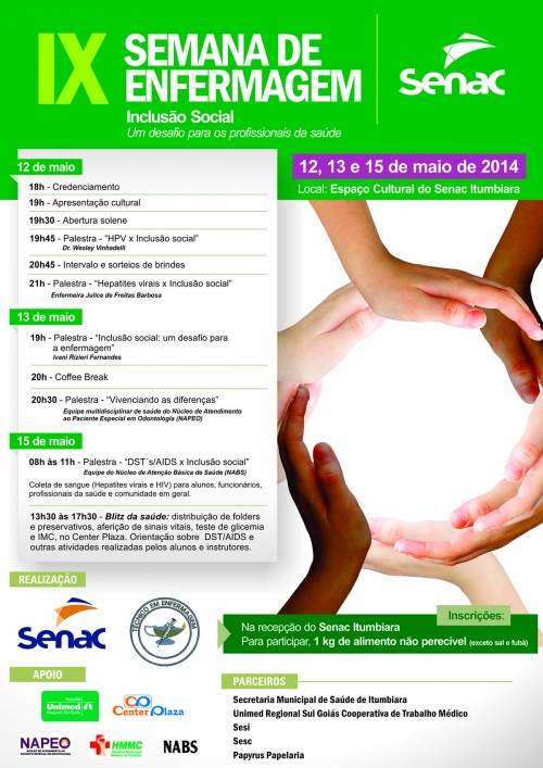 Adrianne VitoreliO Senac de Itumbiara realiza, de hoje, 12 de maio, até dia 15 de maio, a IX semana de Enfermagem, no Espaço Cultural da unidade. O evento tem como tema Inclusão Social – um desafio para os profissionais da saúde.