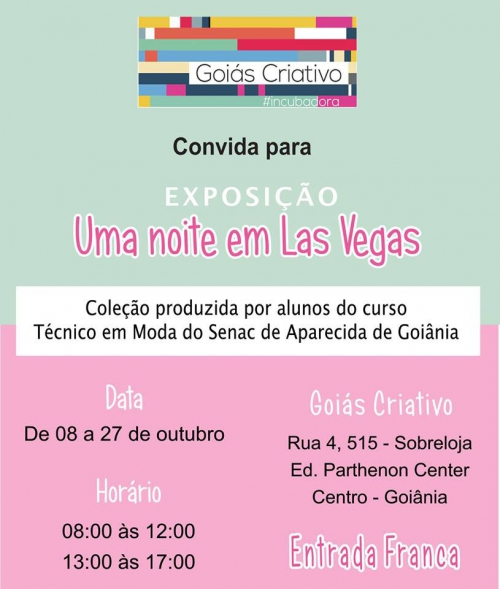 O desfile de moda Uma Noite em Las Vegas, produzido pelos alunos do curso Técnico em Moda do Senac Aparecida de Goiânia rendeu bons frutos. Como extensão do projeto de encerramento do curso e reconhecimento do trabalho da turma, na Incubadora Goiás Criativo, localizada no centro de Goiânia, acontece de hoje (08) a 27 de outubro, exposição Uma Noite em Las Vegas, que traz o lançamento de uma nova coleção inspirada nos luxuosos cenários da cidade.